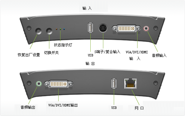 VGADVI Broadcaster是一款小巧便攜的設(shè)備,即7.95英寸x4.13英寸x1.38英寸(202x105x35mm)的大小。按鈕和接口如下所示