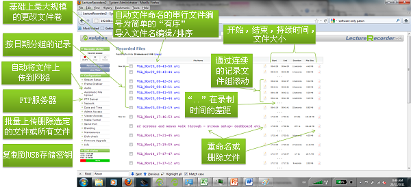 VGADVI Recorder使用一個(gè)基于Web的文件管理器來查看記錄文件,如下所示。每個(gè)文件都有一個(gè)名稱,開始時(shí)間,結(jié)束時(shí)間和持續(xù)時(shí)間字段。文件按日期和分段來分組,形成一個(gè)連續(xù)記錄的時(shí)間表。您可以更改文件名,上傳文件或刪除文件。