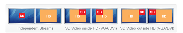 VGADVI Recorder 除了能采集一路高清視頻源(源可以是:電腦顯示器,雷達(dá)顯示器或超聲監(jiān)測(cè)儀等等)之外,還可以采集一路標(biāo)清的視頻(源可以是:攝像機(jī)等等)。它將這些視頻輸入變成兩個(gè)同步的流或者一個(gè)畫中畫的流直接輸出。當(dāng)然,您也可以選擇在內(nèi)容被錄制的同時(shí),直播到遠(yuǎn)程客戶的瀏覽器或媒體播放器上