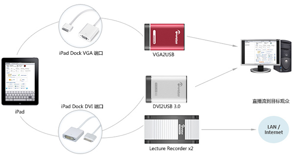 如果你更傾向于從iPad捕獲視頻發(fā)送到網(wǎng)絡(luò),請(qǐng)選擇Lecture Recorder X2 。請(qǐng)注意該設(shè)備能夠同時(shí)從DVI和S-Video端口捕獲視頻。這意味著,如果你創(chuàng)建的播客,視頻教程,培訓(xùn)課程,演示或需要將幾個(gè)視頻合并,Lecture Recorder X2 將滿足你的愿望。此設(shè)備可將輸入的視頻通道流記錄在內(nèi)部固態(tài)存儲(chǔ),網(wǎng)絡(luò)存儲(chǔ),F(xiàn)TP站點(diǎn),或本地USB存儲(chǔ)上。通過(guò)提供的URL地址,你的觀眾能夠使用標(biāo)準(zhǔn)瀏覽器和媒體播放器觀看直播內(nèi)容。