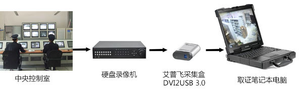 刑偵取證人員可以攜帶著筆記本電腦到控制室,然后只需將硬盤錄像機的輸出監(jiān)視口VGA或是HDMI通過線纜接入到艾普飛采集盒的輸入端,再用自帶的USB線纜接入筆記本電腦,由于艾普飛的設(shè)備非常小巧,還可以嵌入到專業(yè)的工控筆記本電腦中使用,這樣開機即可通過電腦中的專用軟件采集到硬盤錄像機的所有操作及回放視頻畫面,用此做為打擊罪范的最有力的證據(jù)。