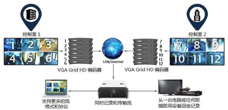 Grid搖控控制室視頻墻記錄下一個事件來采集、記錄和流傳輸多個遠程視頻墻來源。這些源的每一個都可以單獨傳輸流和記錄。VGA