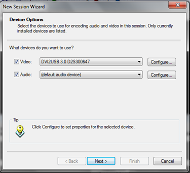 從“Video”視頻下拉列表中選擇DVI2USB,VGA2USB,DVI2PCIe或VGA2Ethernet幀采集設備。如果抓幀器沒有出現在列表中,檢查你的連接,并確保正確安裝了更新的驅動程序。使用Epiphan