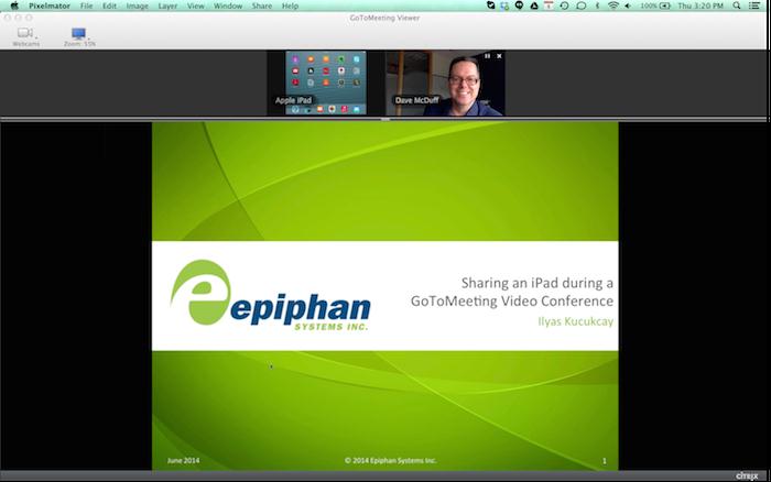 GoToMeeting的高級版使用戶能夠在同一時間分享他們的攝像頭和桌面屏幕。使用一個Epiphan幀或視頻捕獲器,您可以共享一個iPad屏幕像一個攝像頭或是“桌面”。