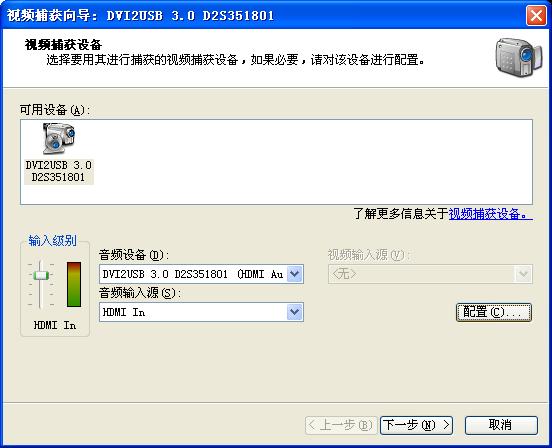 3. 打開視頻捕獲向?qū)Вx擇可用設備為“DVI2USB 3.0”,音頻設備選擇“DVI2USB 3.0 D2S…”, 音源輸入源選擇“HDMI In”,并將左側(cè)的音頻輸入級別調(diào)到想要的位置。
