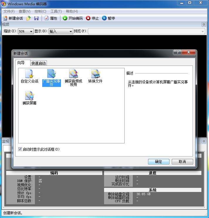 1. 在打開的新建會話窗口中選擇“廣播實(shí)況事件”點(diǎn)擊“確定”。