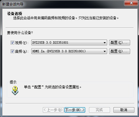 2. 在新建會話向?qū)Т翱谥袑⒁曨l、音頻勾選,從視頻下拉列表中選擇DVI2USB 3.0幀采集設(shè)備(如果抓幀器沒有出現(xiàn)在列表中,檢查你的連接,并確保正確安裝了更新的驅(qū)動程序。使用Epiphan Capture Tool采集工具檢測以確保設(shè)備被識別。)從音頻下拉列表中選擇音頻設(shè)備:HDMI In (DVI2USB 3.0 D2S……),點(diǎn)擊下一步。