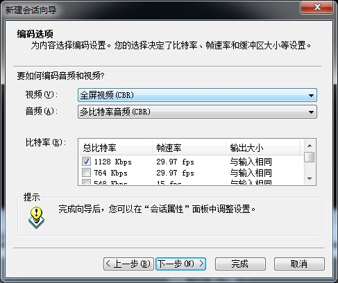 5. 選擇視、音頻的碼流及分辨率大小,先將視頻選擇為“全屏視頻(CBR)”或根據(jù)您自己的需要選擇,點(diǎn)擊下一步。