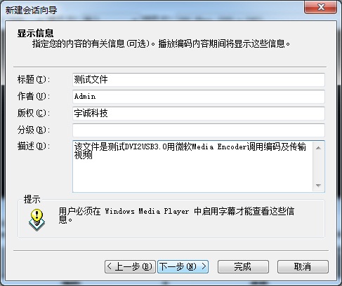 8. 選擇下一步后輸入視頻的一些屬性信息(包括標(biāo)題、作者、版權(quán)、描述等),點(diǎn)擊“完成”進(jìn)入程序。