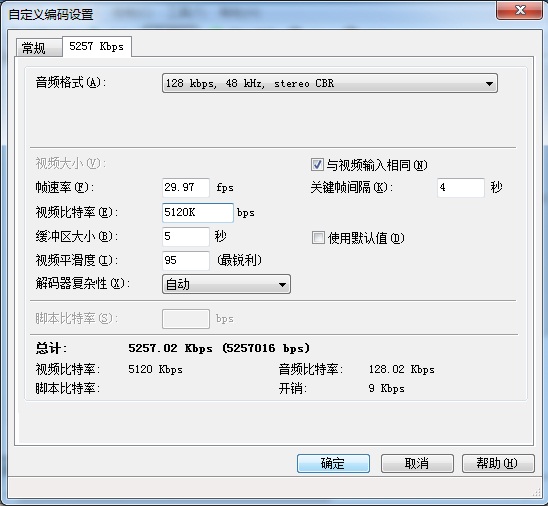 13. 點(diǎn)擊“編輯”進(jìn)入自定義編碼設(shè)置,選擇第二項(xiàng)標(biāo)簽,調(diào)整音頻格式為自己相要的格式。調(diào)整自定義視頻大小或勾選“與視頻輸入相同”,視頻比特率為“5120Kbps”或自定義大小,點(diǎn)擊確定退出編碼設(shè)置。