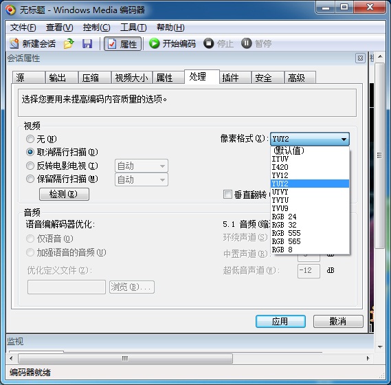 14. 如果想得到更好的編碼質(zhì)量效果,在屬性窗口中的“處理”選項(xiàng)下,將視頻取消隔行掃描,像素格式改為“YUY2”,點(diǎn)擊“應(yīng)用”按鈕保存參數(shù)設(shè)置。