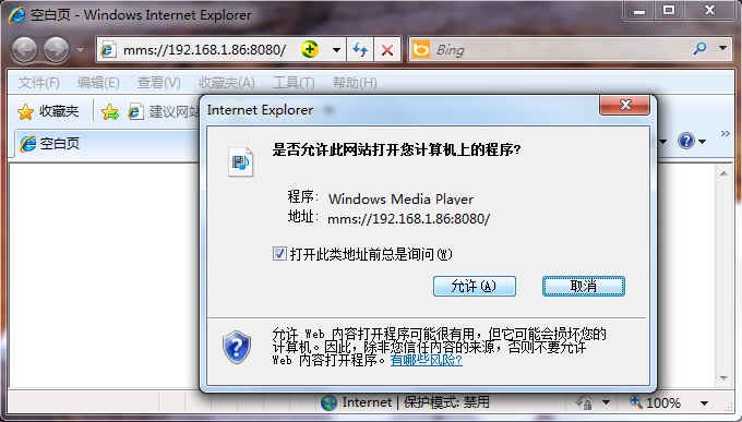 Player軟件接收 廣播流內(nèi)容,IP地址與端口號之間必須用英文的標(biāo)點(diǎn)符號“:”進(jìn)行分隔,如下圖所示,點(diǎn)擊“充許”按鈕用Windows Media