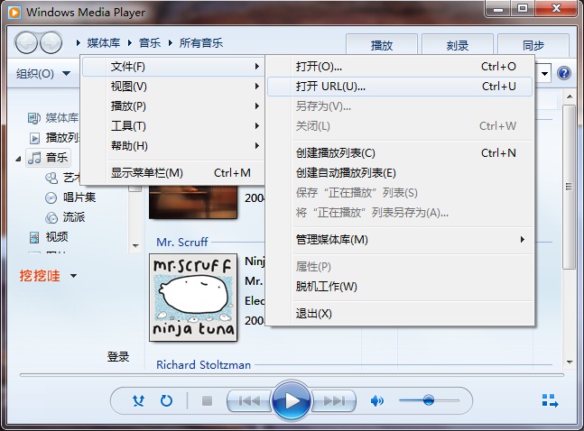 Media Player軟件,在標(biāo)題欄上點(diǎn)右鍵選擇“文件>打開URL(U)”。
