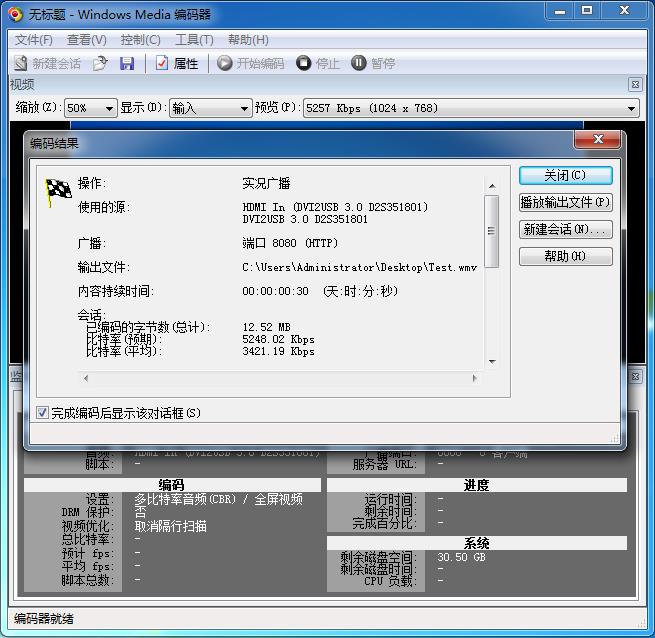 如果想停止編碼,則點(diǎn)擊工具欄中的“停止”按鈕即可,此時流傳輸停止且本地形成視頻文件,并出現(xiàn)一個“編碼結(jié)果”的窗口,點(diǎn)擊“播放輸出文件”則調(diào)用系統(tǒng)中的播放軟件播放該視頻文件,也可在關(guān)閉程序后到本地存儲位置找到視頻文件播放。