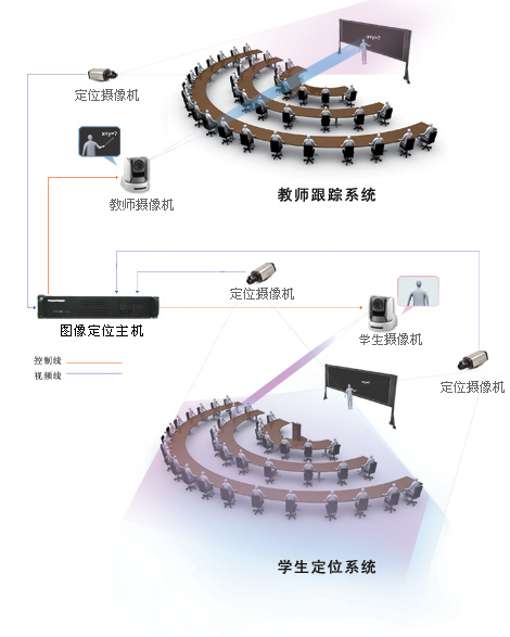 PowerCreator Graphic Position System 由兩個子系統組成:教師跟蹤系統與學生定位系統。教師跟蹤系統自動計算教師在講臺上的位置,通知教師攝像機進行轉動;學生定位系統自動識別站立學生所處的位置,通知學生攝像機進行定位,以特寫的方式進行拍攝。