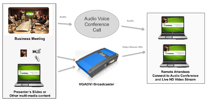 VGADVI Broadcaster能簡單的捕捉會議的音視頻來源(主持人,音頻,和主持人的筆記本電腦顯示)。然后VGADVI Broadcaster合并這些音視頻到一個畫中畫的視頻流。遠程與會者撥入到音頻會議并連接URL查看現(xiàn)場直播的視頻會議。