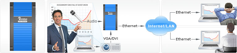 一旦您使用了能夠捕捉視頻/音頻信號,并且可通過網絡播送的設備,您就能從視頻會議中受益。攝像機通過信號輸出連接到廣播設備,麥克風插入廣播設備的音頻端口。您的工作伙伴打開Web瀏覽器,您們都連接至互聯網并開始通信。廣播設備準確地傳送,這確保看安全和低成本的通信的視頻和音頻數據流。 Epiphan VGA Broadcaster可用于這些目的,并可與任何操作系統兼容。這個溝通過程可能沒有您使用昂貴的獨立系統時那樣順暢,但顯然這個廣播解決方案是真正的物有所值。它使傳統視頻會議設備的終端用戶能獲得多個優勢。