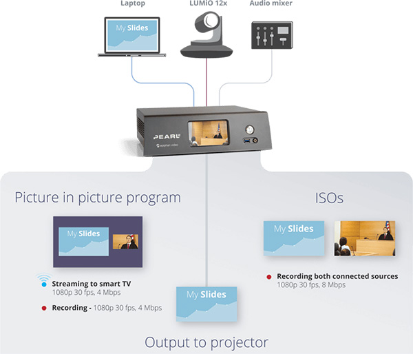 Pearl-2是一個“一體化”的現(xiàn)場制作混音器,這意味著它能同時進(jìn)行足夠強(qiáng)大的編碼,流式傳輸和錄制您的現(xiàn)場直播節(jié)目。 活動開始時,使用智能電視的內(nèi)置UPnP連接直播。 如果需要,您還可以使用Pearl-2的HDMI輸出端口在主會議室內(nèi)的其他本地顯示器上顯示所需的源或布局(例如演示幻燈片)。